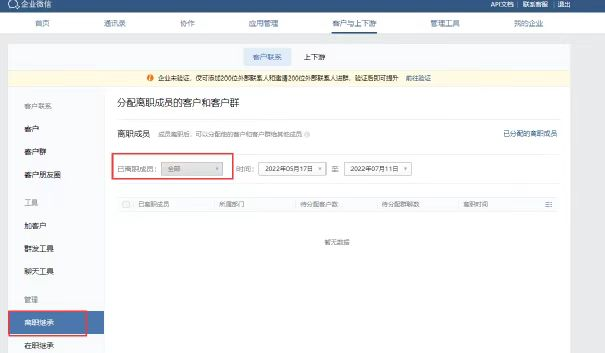 如果要使用離職繼承功能,企業(yè)管理員可以進入企業(yè)微信后臺,從“通訊錄”把離職成員刪除。刪除之后,找到【客戶聯(lián)系】—【離職繼承】,選擇離職員工的客戶及客戶群,分配給其他員工管理跟進。