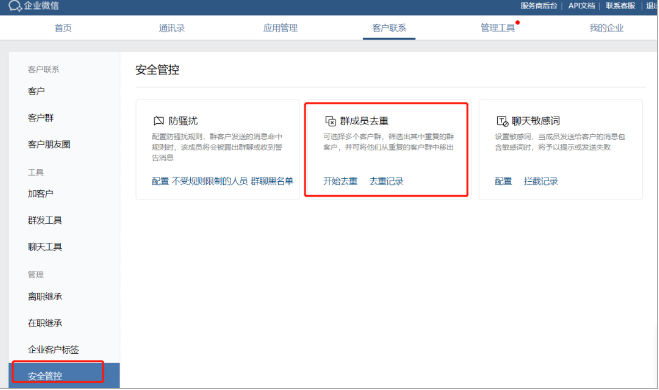 答案是肯定的,企業微信后臺就有群成員自動去重功能。先登錄企微管理后臺,在【客戶聯系】—【安全管控】中找到【群成員去重】。