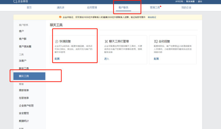第一,企業管理員登錄企業微信后臺,進入【客戶聯系】頁面,并找到【聊天工具】按鈕,點擊進入。