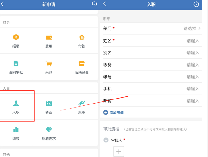 員工只需要打開企業(yè)微信,找到【工作臺】就能在【審批】界面提交入職申請。這時,我們要謹慎填寫自己的個人信息,選擇對應的審批人,方便上級審批。
