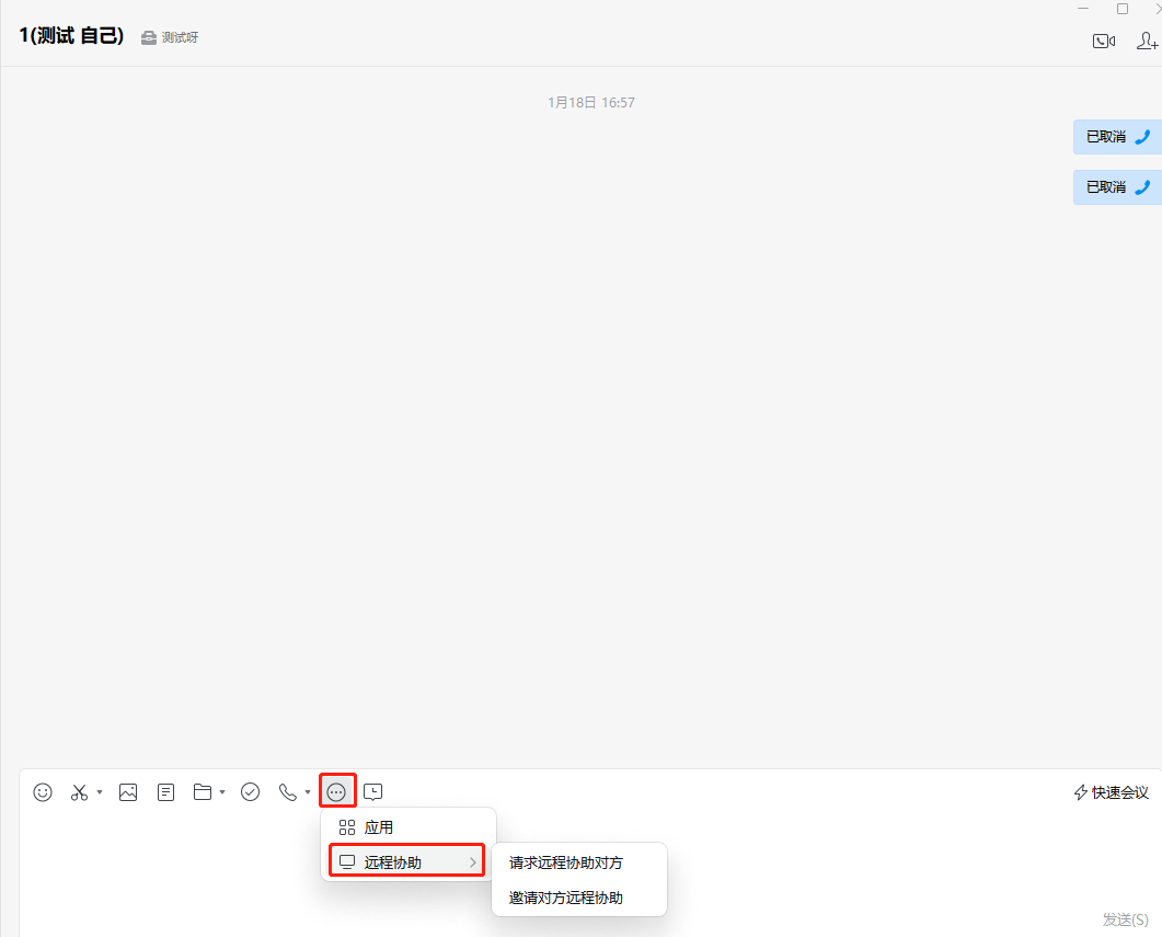 7.若給未激活成員發(fā)送遠(yuǎn)程,會一直顯示發(fā)起中,然后自動掛斷,需引導(dǎo)用戶提供雙方會話截圖,確認(rèn)有發(fā)送,對方在對應(yīng)的時間有登陸到對應(yīng)的企業(yè)沒有收到這個申請的截圖或錄屏。