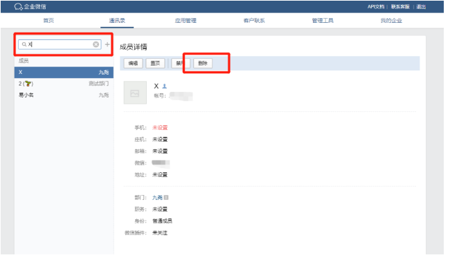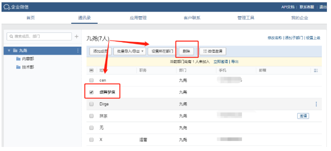 如果企業(yè)成員比較多,不能很快找到離職員工,在左側(cè)【搜索成員、部門】中快速搜索離職員工,然后點(diǎn)擊【刪除】按鈕就能刪除這個(gè)員工了。