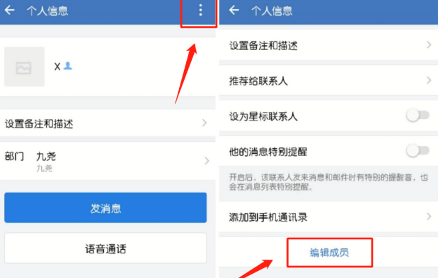 接著點(diǎn)擊離職成員個(gè)人信息頁(yè)面上的“三個(gè)點(diǎn)”,再點(diǎn)擊編輯成員,就會(huì)出現(xiàn)刪除成員選項(xiàng)。