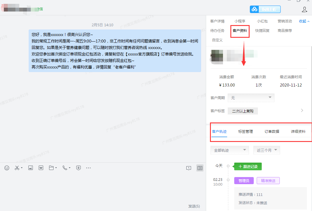 還可以用到艾客scrm【客戶畫像】功能,幫助記錄客戶詳細(xì)動(dòng)態(tài),包括每次對(duì)話的時(shí)長(zhǎng),打開你發(fā)送的文件鏈接沒有、客戶群是否重復(fù)、客戶加了哪些員工等信息。