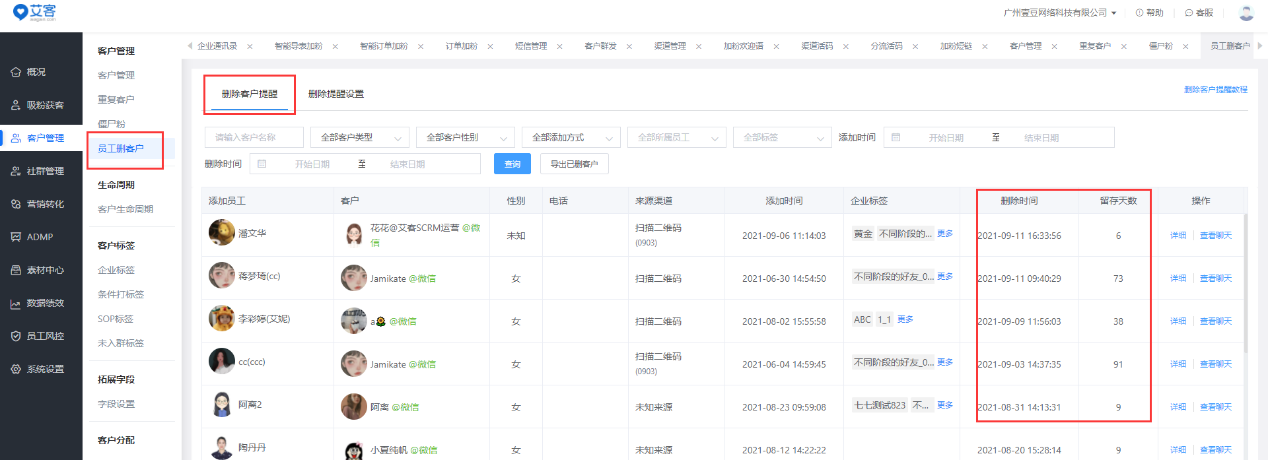 管理員可在管理端根據時間、員工等維度進行篩選查詢僵尸粉,例如可以找出最近一周某個員工流失客戶情況。