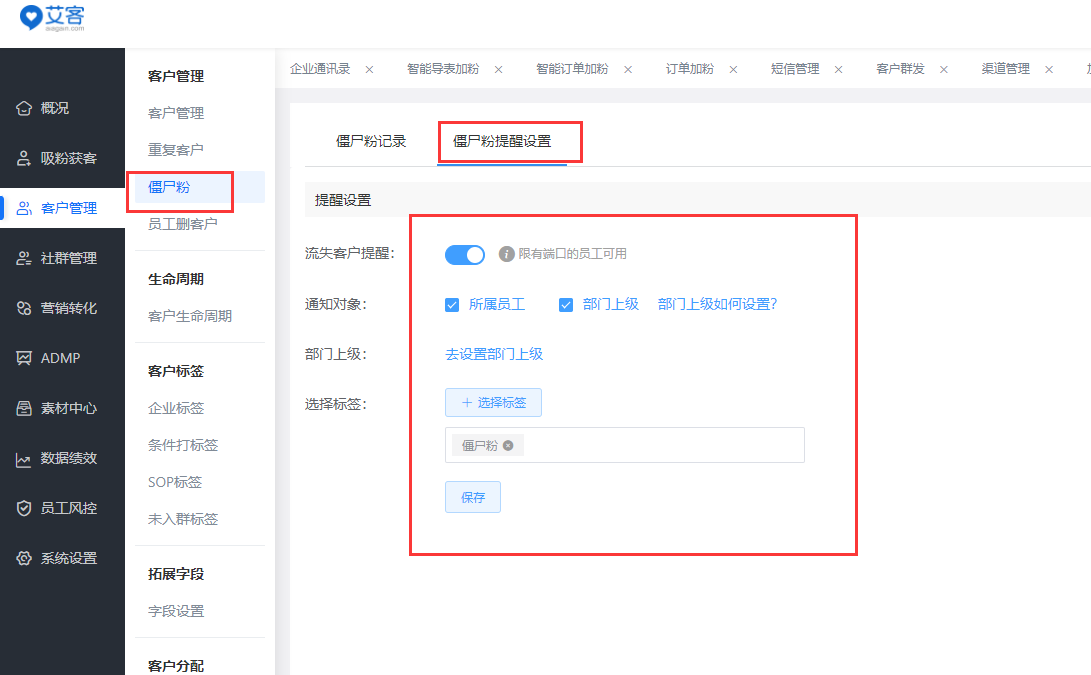 企業(yè)可以對僵尸粉進(jìn)行提醒設(shè)置,設(shè)置內(nèi)容包含流失客戶提醒;提醒所通知的對象,比如所屬員工、部門上級,還可以對部門上級進(jìn)行設(shè)置,最后可以對標(biāo)簽進(jìn)行選擇。