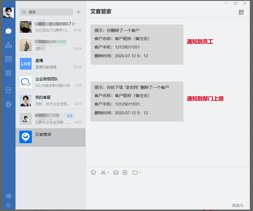 另外。當(dāng)員工刪除客戶時,通過使用艾客的【員工刪除客戶】功能,艾客助手會實(shí)時通知員工和這個員工所屬部門的上級。通知提醒讓管理者可以實(shí)時監(jiān)控客戶被刪情況,判斷是否及時挽回,減少企業(yè)客源流失。