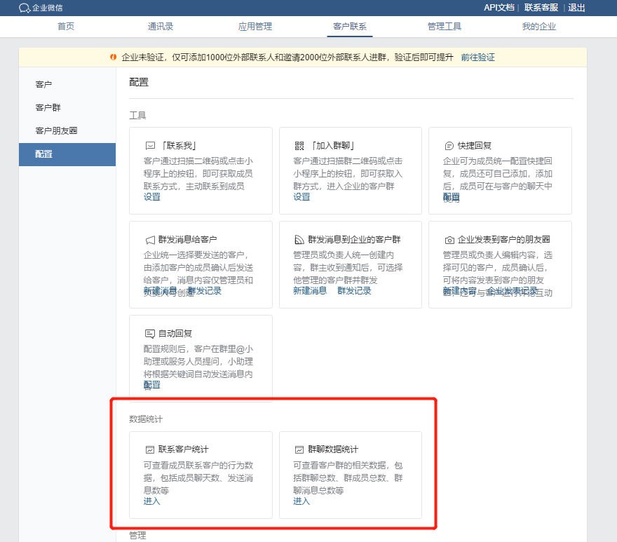 企業微信后臺有個“客戶聯系”板塊,里面的“配置”里,有相關的“聯系客戶統計”以及“群聊數據統計”。通過這兩種數據,企業可以清楚了解到員工手上的客戶質量以及工作態度。