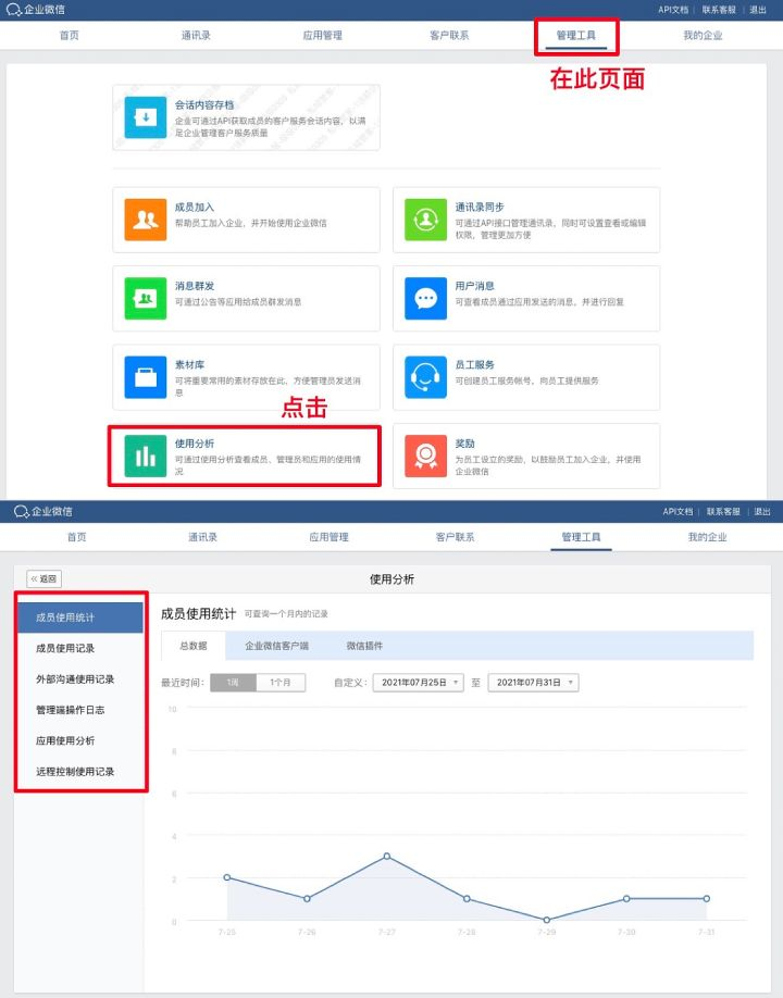 企業也可以登錄企業微信管理后臺,在“管理工具”上有個“使用分析”,在這個使用分析里,可以查看到企業成員使用統計、成員使用記錄等分析數據。