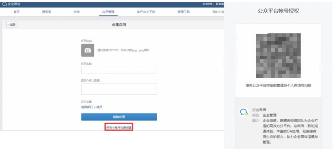 怎樣關聯小程序,可以根據以下步驟:在“應用管理”點擊“創建應用”——“已有小程序快速創建”,之后頁面會自動跳轉到進行賬號授權的頁面,企業微信管理員掃碼授權即可。