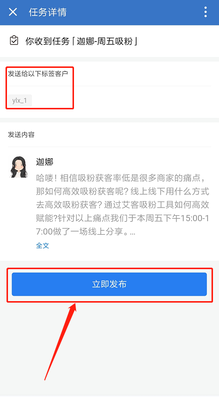 企業可以使用艾客的朋友圈SOP任務去解決這個問題,企業微信管理員提前設置好朋友圈SOP任務,系統會定時自動推送發圈通知給執行員工的企業微信,員工在企業微信手機端點擊一鍵發布朋友圈即可,實現自動化下發發圈任務,提高效率。