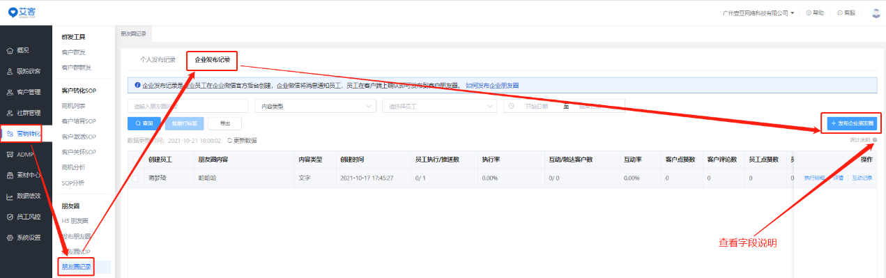 有何辦法可以讓客戶看到更多的企業朋友圈歷史記錄呢?可以使用艾客SCRM系統的朋友圈記錄功能,就可以查看所有的朋友圈發布記錄了,包含個人發布內容和企業發布內容。