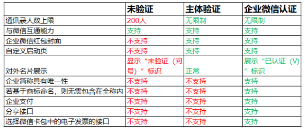 企業(yè)微信不認證也是可以進行使用的,但是對企業(yè)微信很多功能上的使用會受到限制而無法使用。比如在添加好友人數(shù)上、在支付功能上、在對接口的分享上都存在差別。下圖就是未驗證的企業(yè)微信、經(jīng)過主體驗證的企業(yè)微信、認證過的企業(yè)微信它們之間的區(qū)別。