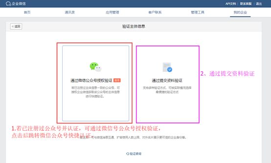 登錄企業(yè)微信后臺,我的企業(yè)——企業(yè)信息——驗證主體信息——提交資料驗證,選擇驗證方式有兩個,如果選擇“通過提交資料驗證”,就可以看到“企業(yè)微信認證”的選項了。之后按照各種步驟提交資料進行審核,加上繳納300元的審核費用,然后大約等待5個工作日即可。