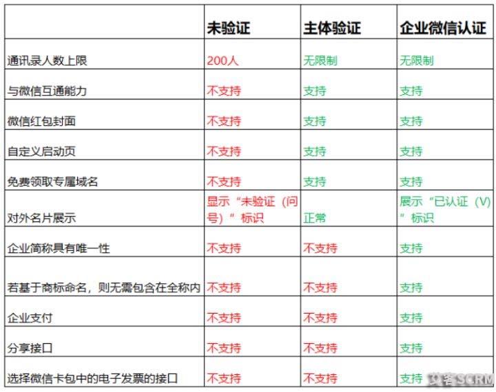 看下圖,我們知道未驗證的企業微信在通訊錄人數上限和已認證的企業微信相差很大,而在與微信互通、企業簡稱唯一性、企業支付等功能上是不支持的。