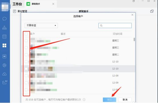 三、點(diǎn)擊【選擇客戶或客戶群發(fā)送】-再點(diǎn)【發(fā)送給客戶】,勾選客戶,點(diǎn)【確定】
