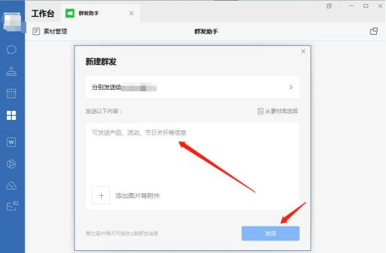 四、最后輸入【群發(fā)內(nèi)容】,點(diǎn)【發(fā)送】即可。
