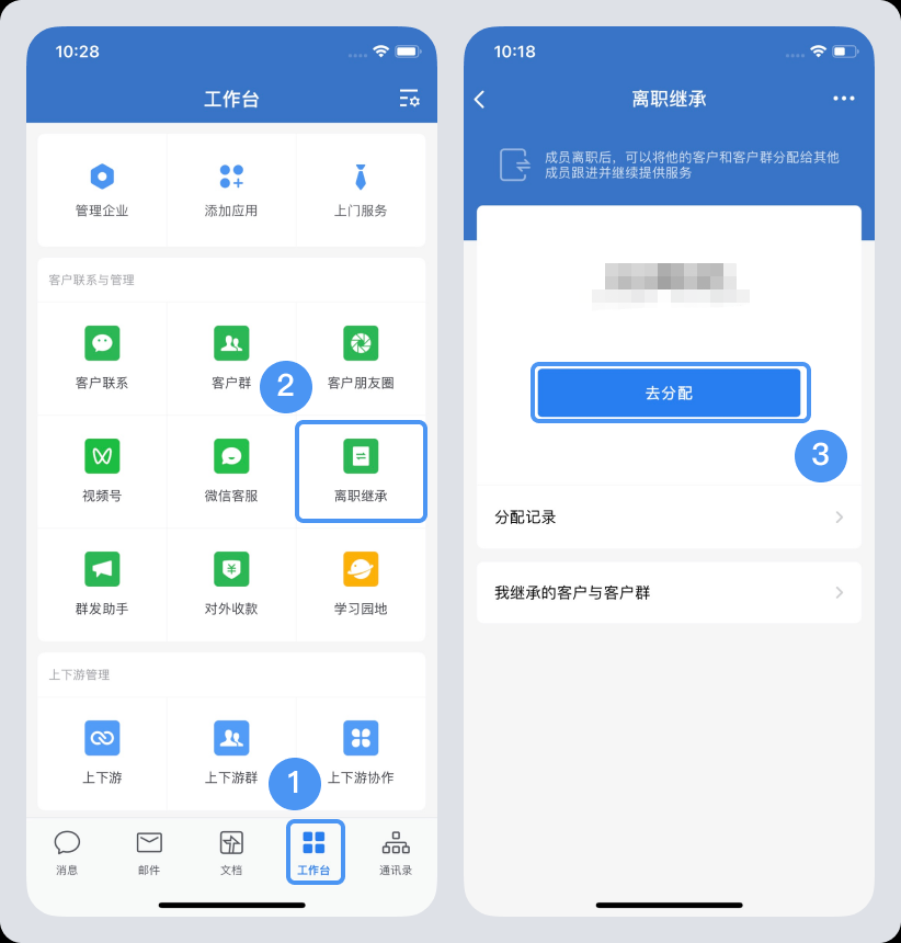 手機端:登錄手機版企業微信,進入“工作臺”——“離職繼承”——“去分配”,就可以對離職成員的客戶和客戶群進行分配了。