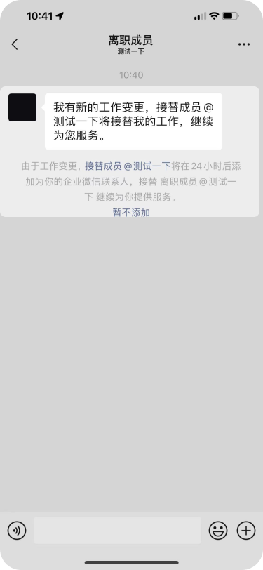 進行離職繼承分配操作后,該離職成員的客戶會收到一條消息,消息下方有個“暫不添加”,如果客戶點擊它,那么接替離職員工的那位在職員工就添加此位客戶不成功。如果客戶24小時內無視這條消息,那么此客戶在接到這條消息的時間點開始算,24小時后自動添加新接替的在職員工成為聯系人。并且在接替工作完成后,該在職員工也可以查看所有客戶的添加情況。