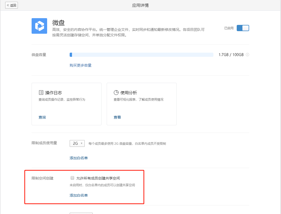 企業想要創建共享空間,需要有權限。如果沒有創建權限,那么在微盤中是無法查看到創建空間的入口的。開通權限的步驟是:企業微信管理員在企業微信后臺,“管理工具”—“應用互聯”—“微盤”—“限制空間創建”—“開啟允許所有成員創建共享空間”,如果不想開啟允許所有成員,也可以選擇添加白名單。