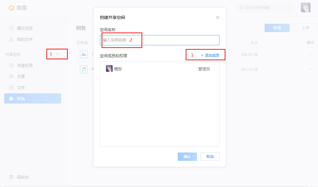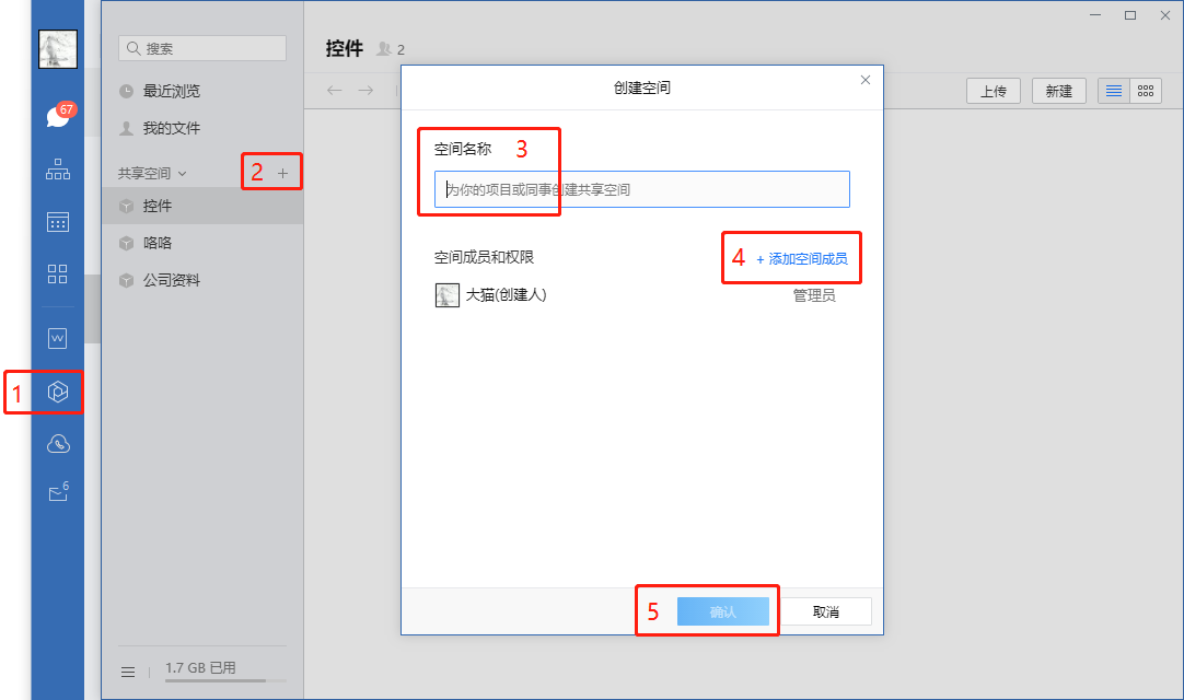 2、企業微信創建:登錄企業微信工作臺,打開客戶端左側欄微盤圖標—共享空間“+號”—“空間名稱”—“添加空間成員”,就可以創建成功了。