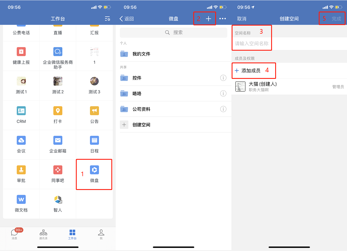 3、手機端企業微信APP創建:“工作臺”—“微盤”—“+號”—“空間名稱”—“添加成員”,就可以進行創建了。