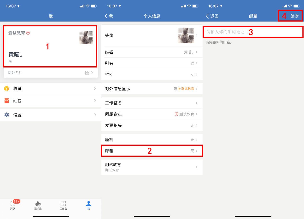 1、企業微信手機版:“我”——“頭像”——“郵箱”——“輸入新的郵箱”。