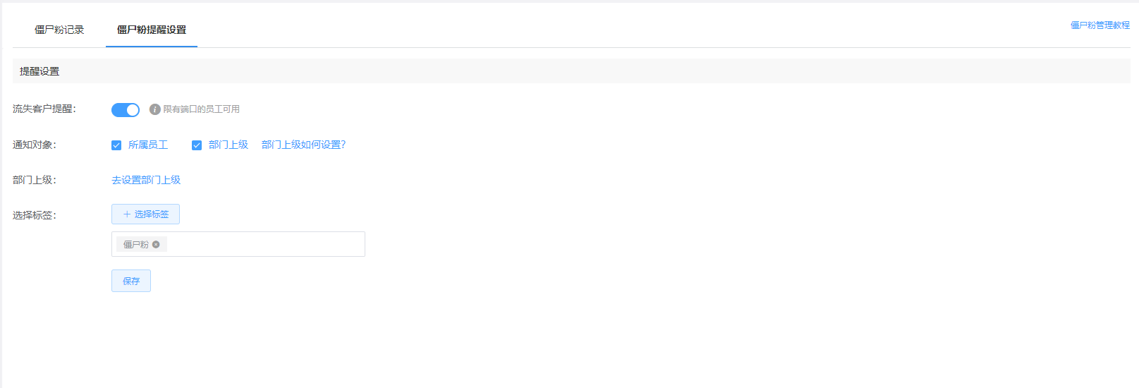 然后,進(jìn)入艾客scrm后臺,進(jìn)入客戶流失頁面,打開被刪除提醒,同時(shí),可以選擇通知對象,通知所屬員工或部門上級。