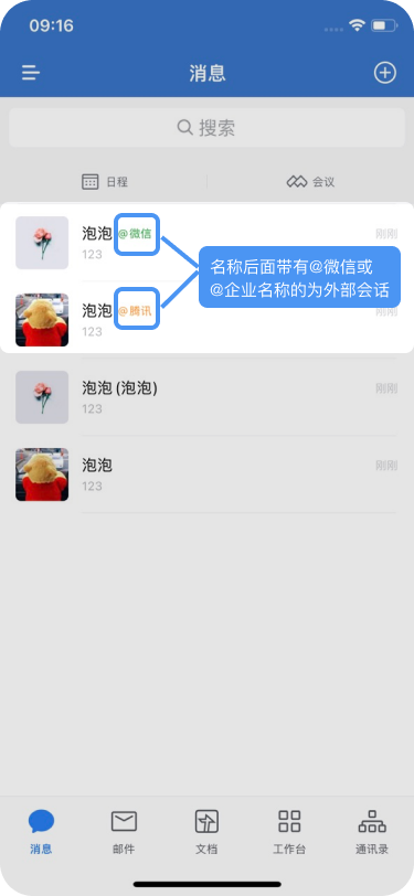 企業(yè)微信可以通過電腦端和手機(jī)端進(jìn)行添加外部聯(lián)系人。外部聯(lián)系人比較顯著的標(biāo)志是聯(lián)系人名稱后會(huì)帶有@后綴顯示,如下圖: