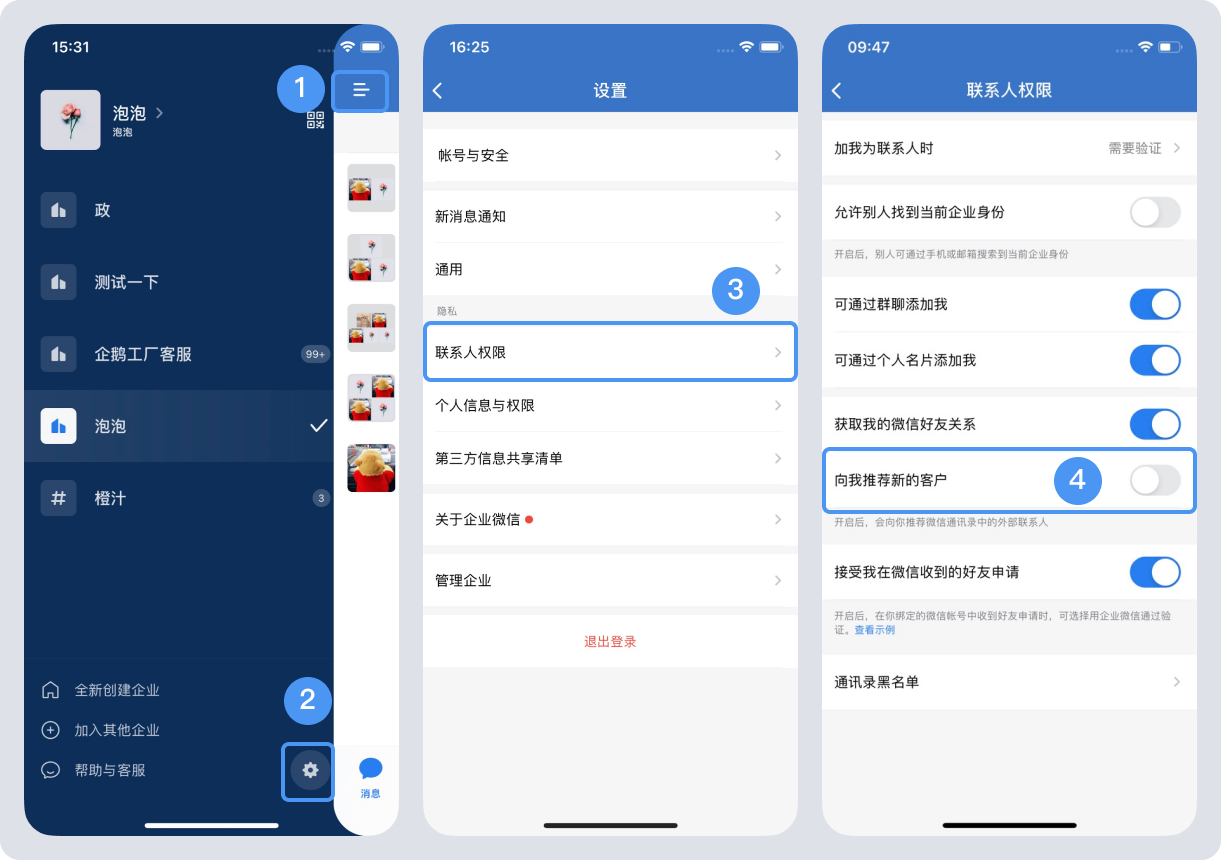 6、通過推薦的微信聯(lián)系人發(fā)起添加好友,就是把聯(lián)系人里面的某一個(gè)權(quán)限打開,這個(gè)權(quán)限就是“想我推薦可能的客戶”。開啟之后,添加了新的微信聯(lián)系人,就可以在企業(yè)微信“通訊錄”——“可能的客戶”入口添加微信好友為企業(yè)微信好友了。權(quán)限開啟方式如下圖: