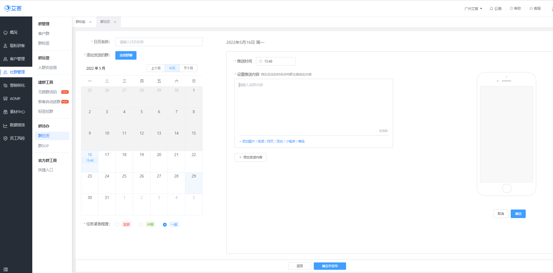 管理員不僅可以利用【艾客SCRM】制定SOP,每日準(zhǔn)時(shí)提醒員工進(jìn)行內(nèi)容推送,還可以將本周、本月的工作安排提前設(shè)置在【群日歷】中,讓員工的工作安排一目了然。同時(shí)管理員還可以在群日歷中給對應(yīng)的群添加日歷任務(wù),到達(dá)指定時(shí)間后系統(tǒng)將自動(dòng)通知對應(yīng)的員工去執(zhí)行對應(yīng)的任務(wù)。