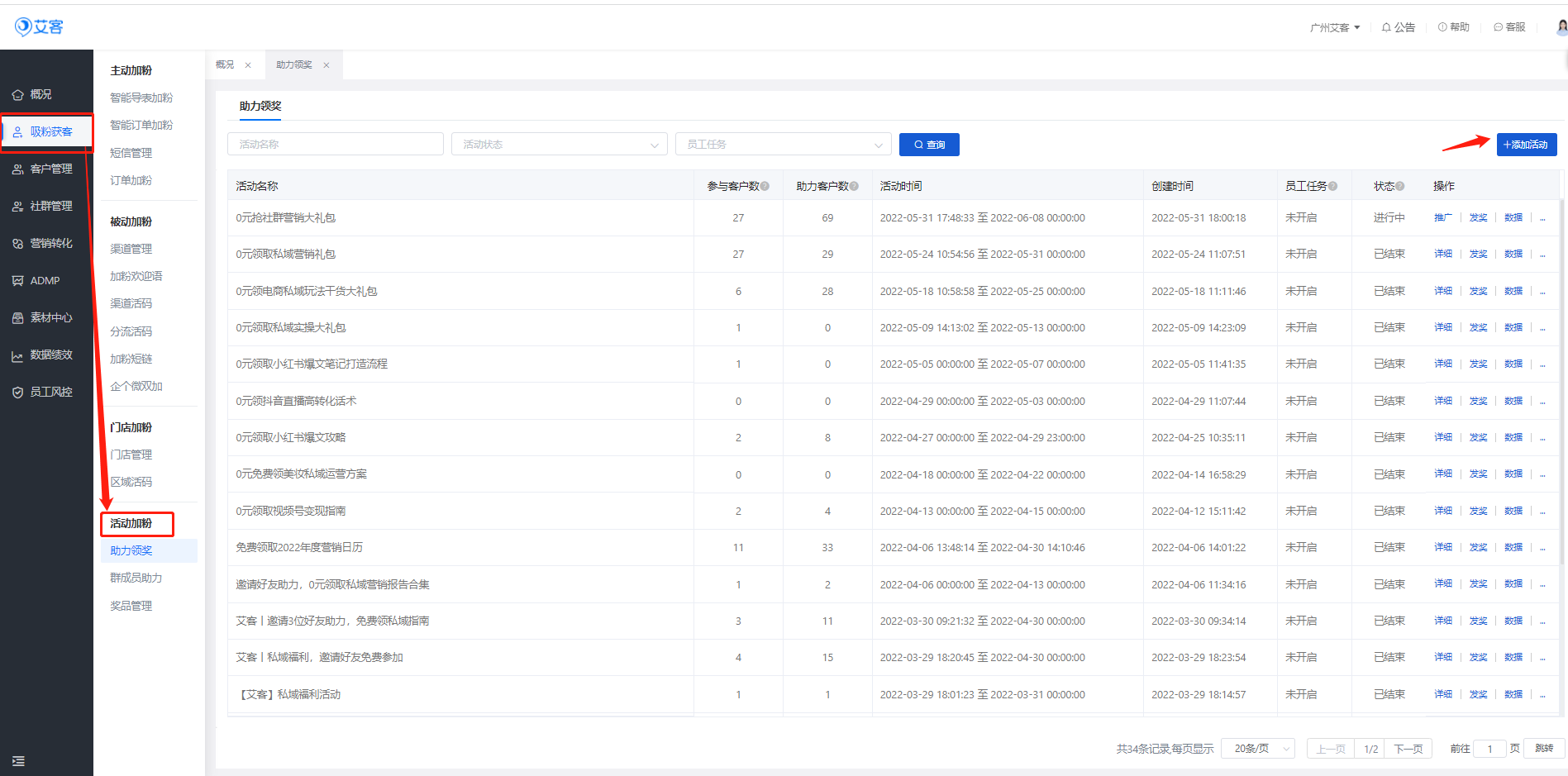 其中,艾客SCRM裂變任務功能,就能幫助商家實現裂變,新客帶新客,起到拉新作用。商家通過設置好友/群成員助力活動,并通過各個渠道分發給好友或其他潛在用戶進行拉新。好友或用戶獲得任務鏈接后,進入活動獲得自己的助力海報,分享給自己的好友,好友掃碼添加商家的員工給好友助力,完成助力可領取獎品。