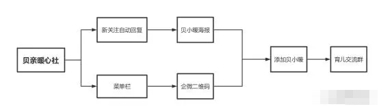 “貝親暖心社”是客戶關注公眾號之后,會收到歡迎語,從歡迎語中獲取數字,發送數字后獲得加好友海報,掃碼添加貝小暖,由貝小暖邀請入群。