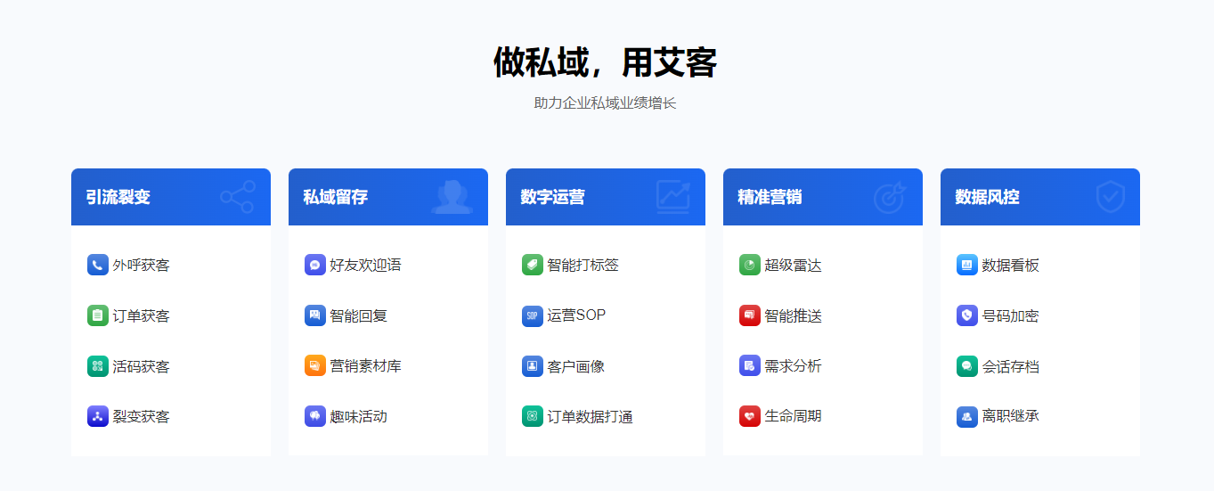 比如客戶轉化率低、手忙腳亂效率極低等,這時候就會發現我們需要私域流量運營工具來解決。艾客SCRM系統就是一款專業可靠的企業微信私域流量運營神器,提供了渠道活碼、自動打標、流失提醒、會話存檔、超級雷達等很多實用功能,幫助企業提高轉化率。